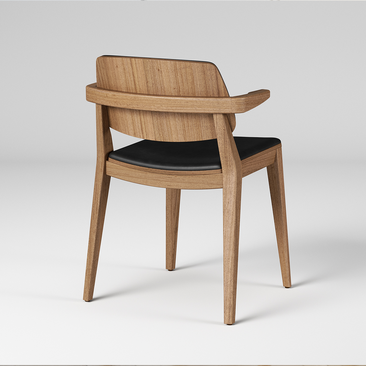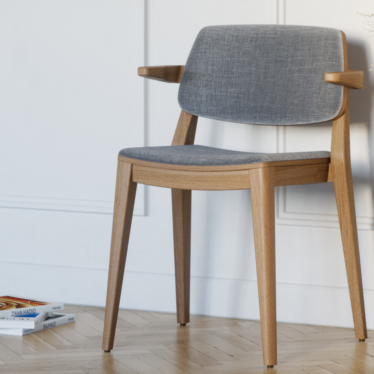 This chair has a solid wood frame with a curved seat and backrest design. The chair has a classic shape that includes armrests as part of its stylized design. The chair is extremely comfortable and fairly light weight.