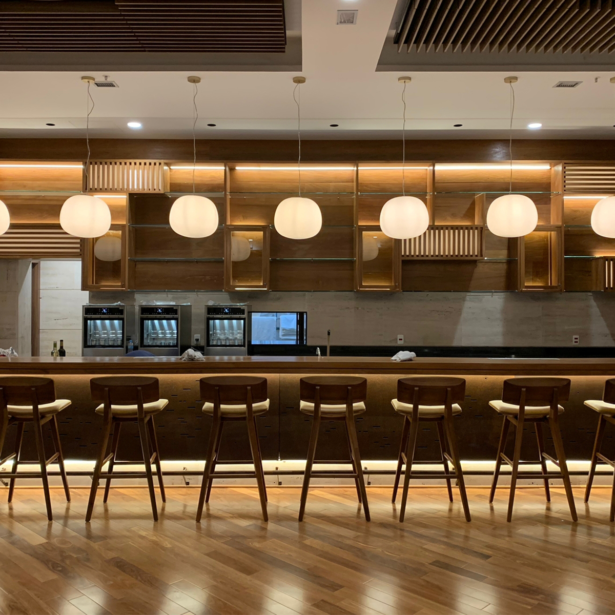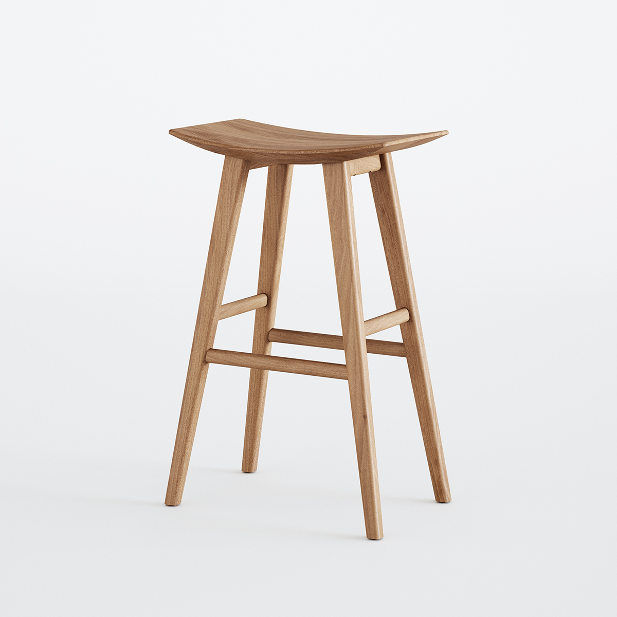 This stool has a solid wood frame with a curved seat. This Japanese-inspired design can be ordered with or without a backrest.