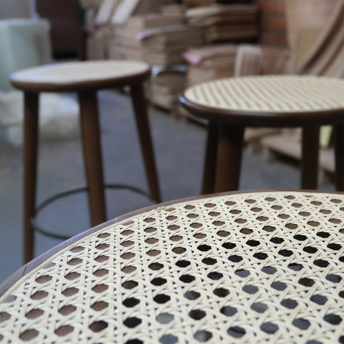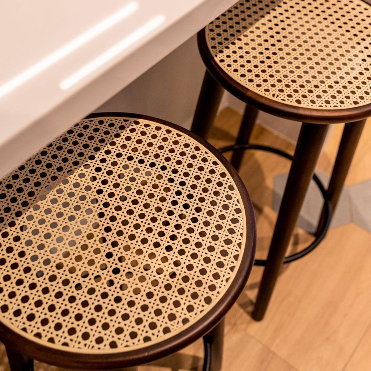 This stool has a solid wood frame with a ratan seat and metal footrest. The clean classic lines of the stool make it a perfect fit for any space.